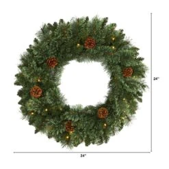 HomPlanti 24″ White Mountain Pine Artificial Christmas Wreath With 35 LED Lights And Pinecones