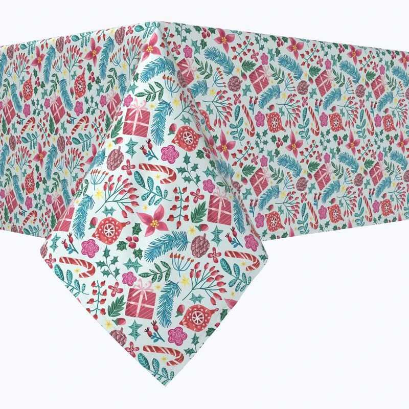 60″ x 84″ Rectangle Tablecloth. Made in the USA, 100% Polyester. Hemmed Edges. Seamless cloth. Machine Washable with Light Iron touch up as needed. Will soften after each wash. Engineered to resist stain absorption. Perfect for all occasions!
