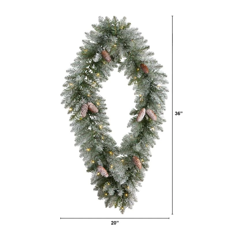 1 x 3′ Holiday Christmas Geometric Diamond Frosted Wreath with Pinecones and 50 Warm White LED Lights