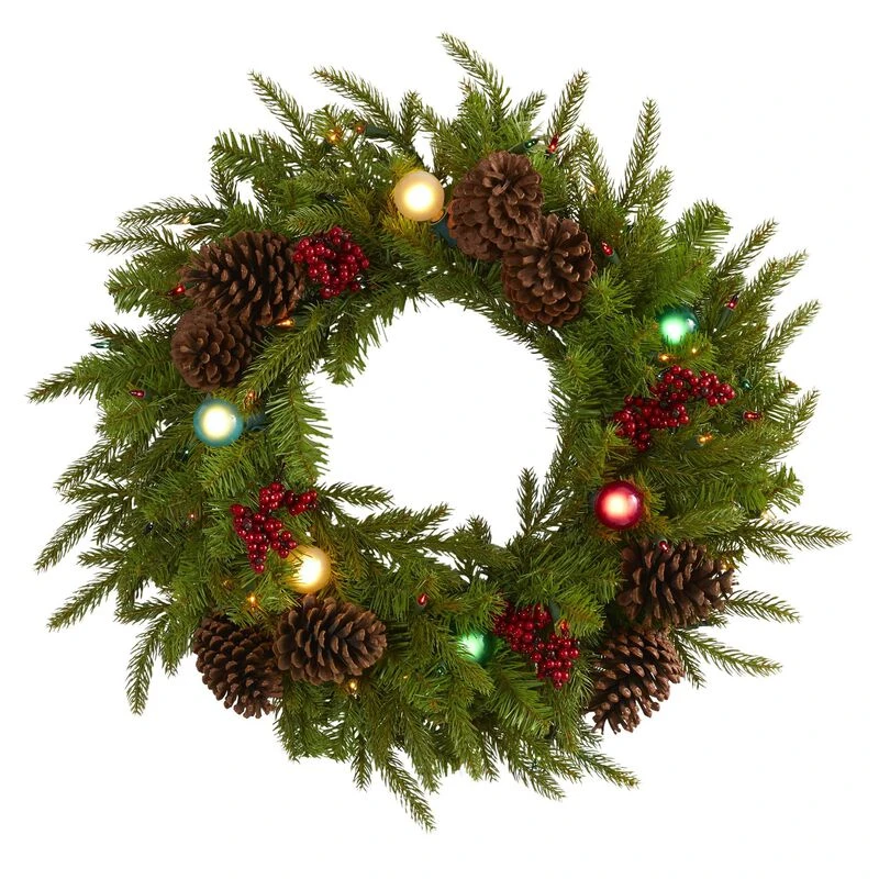 Light up seasonal accents while adding curb-side appeal with this artificial Christmas wreath designed from realistic looking foliage in seasonal evergreens, accented throughout with faux pinecones and holly berries that look incredibly real. Pre-strung with 50 multi-colored LED lights in addition to 7 round (G40) bulbs to illuminate a wall or door, this 24’ (in circumference) decorative wreath will transform any entrance throughout the holiday season.