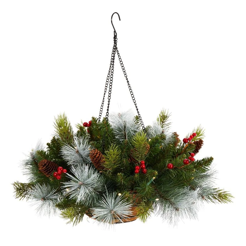 Spread holiday cheer in those tough to reach areas with this pine and berries artificial Christmas hanging plant. Display your Christmas cheer with these fine evergreens branches, accented by pine and berries, so lifelike you’ll think they’re real. Light up this accent with the pre-strung 30 LED lights. Standing 24in., add to any space in need of some life. Perfect for a compact area or a space that needs more holiday cheer. Artificial plants are manufactured using synthetic materials, such as polyester material or plastic, and are well designed and constructed to be life-like in appearance. This item will need to be re-shaped when removed from the secure box to allow it to reach its fullest size. Your artificial plant will look beautiful for years to come; simply wipe clean with a soft dry cloth when needed.