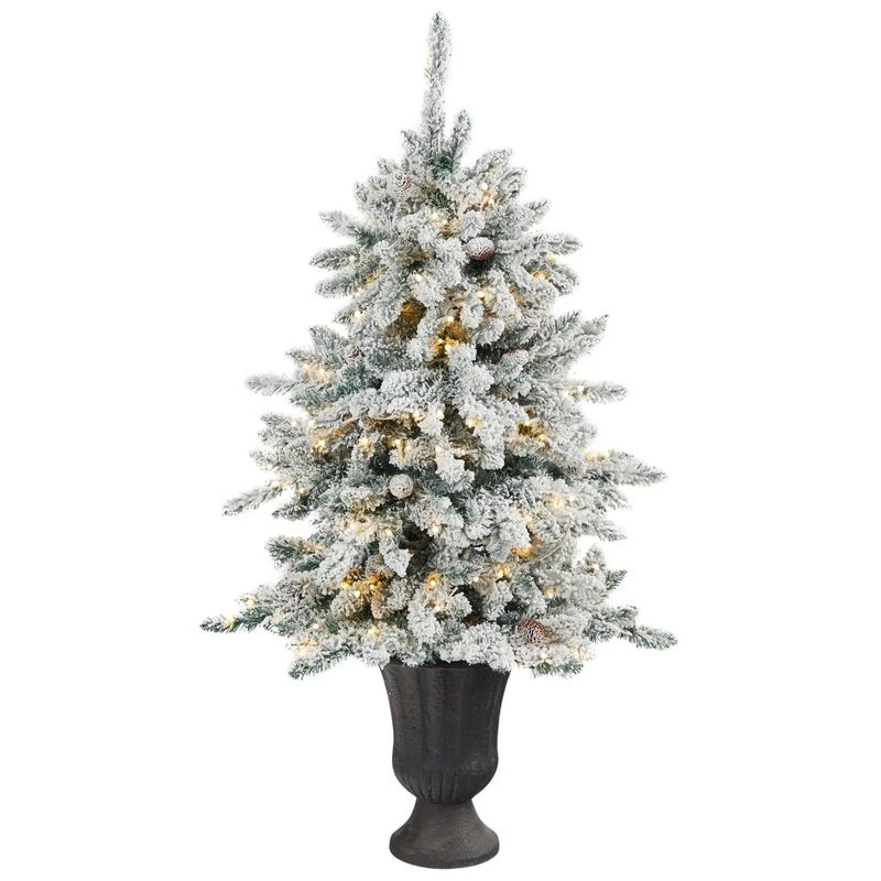 Transform your home into an enchanting winter wonderland with this flocked Livingston Fir Artificial Christmas Tree. If you dream of a white Christmas, these artificial trees are designed to mimic the texture and foliage of real trees with their upward sloping branches that can easily house mini ornaments. Adorned with pinecones throughout and pre-strung with 150 clear warm LED lights for a warm, candle-like glow, all that’s missing are your ornaments. Standing at 4.5’ from a charcoal urn (included in height), this flocked tree complements compact spaces that need some Christmas love. Everyone can have a white Christmas even if you live in the tropics.