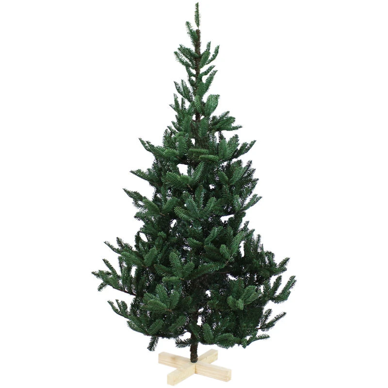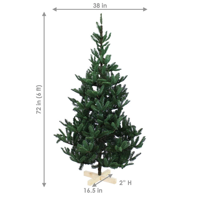 Artificial Christmas tree with wood base. Made of a 35% PE and 65% PVC blend. Includes one 6-foot tall tree. Features hinged branches for easy assembly