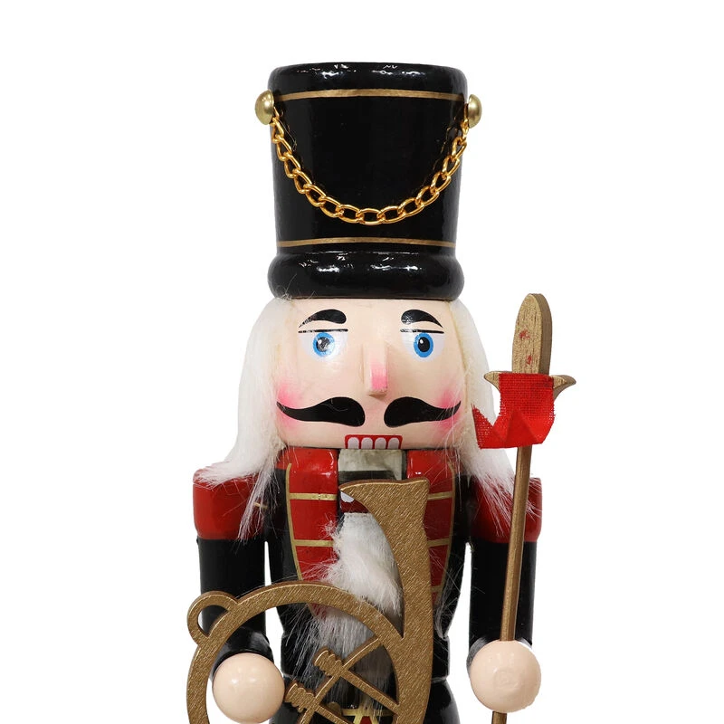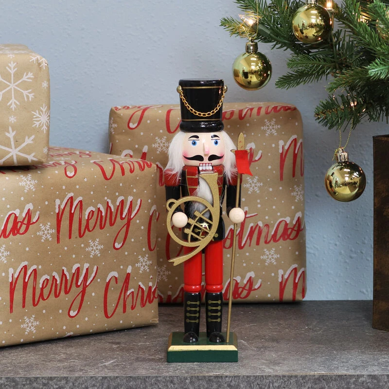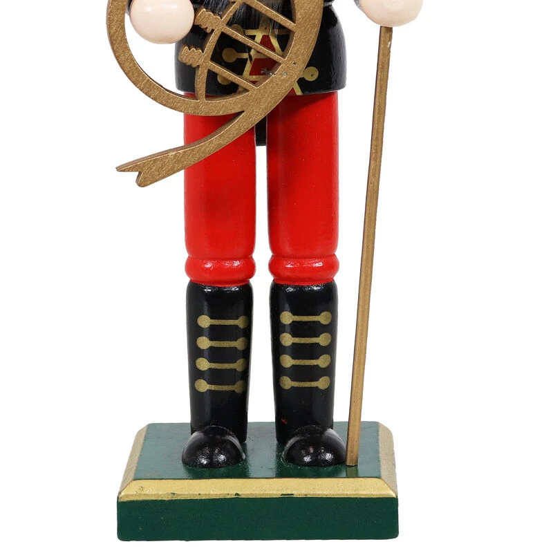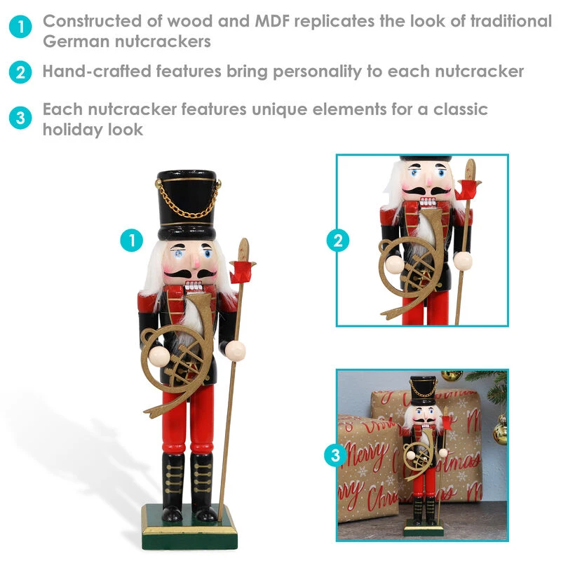 Add holiday cheer to the home with Oscar the powerful indoor nutcracker statue. Oscar stands ready with his French horn and banner in hand to herald the Christmas season. This attractive indoor statue would look beautiful when placed on the living room table, on the fireplace mantel, next to the Christmas tree and presents, on a dresser, bookshelf, desk, or any other place inside the home that needs more Christmas cheer. He is designed to replicate the appeal of traditional German nutcrackers with his wood and MDF construction. Oscar features a black, red, white, and golden classic color scheme with details in his hat, horn, and vest for added holiday fun. This seasonal piece of decor comes preassembled and is ready to display with a variety of holiday accents. Please note that this nutcracker statue is for decorative purposes only. It should not be used to crack nuts or other food. WARNING: This product can expose you to chemicals including Lead, which is known to the state of California to cause cancer and birth defects or other reproductive harm. For more information go to www.P65Warnings.ca.gov.